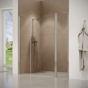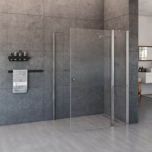 מקלחון פינתי | דופן קבועה + דלת + דופן קבועה | פרופיל כרום | זכוכית שקופה | דגם אלברט | מק"ט 1341