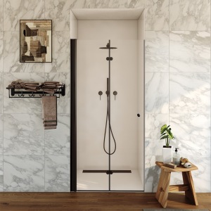 מקלחון חזית | דופן קבועה + דלת על ציר נפתחת פנימה והחוצה | פרופיל שחור מט | זכוכית שקופה | דגם "לוגן" | מק"ט 1280