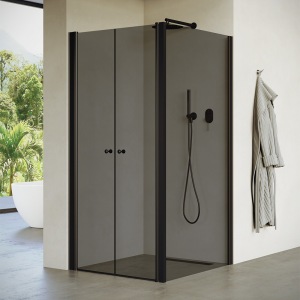 מקלחון חזית | שתי דלתות נפתחות פנימה והחוצה | פרופיל שחור מט | זכוכית אפורה | דגם "קווינזי" | מק"ט 1310