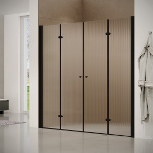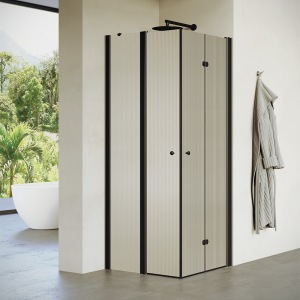מקלחון חזית | שתי דלתות נפתחות פנימה והחוצה | פרופיל שחור מט | זכוכית פסים | דגם "קווינזי" | מק"ט 1302