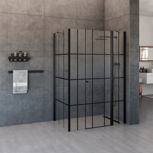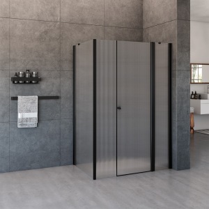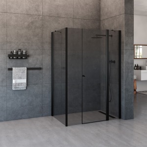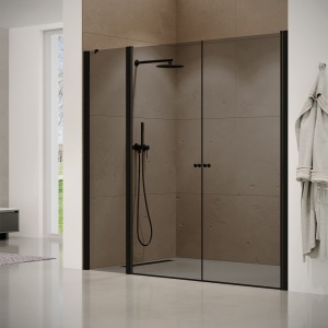 מקלחון חזית | קבוע + שתי דלתות | פרופיל שחור מט | זכוכית אפורה | דגם "קאטרו" | מק"ט 1299