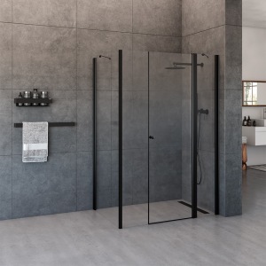 מקלחון חזית | דופן קבועה + דלת על ציר נפתחת פנימה והחוצה | פרופיל שחור מט | זכוכית אפורה | דגם "לוגן" | מק"ט 1278