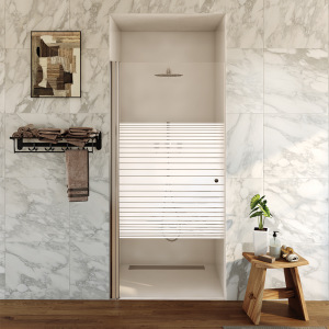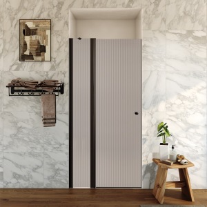 מקלחון חזית | דופן קבועה + דלת על ציר נפתחת פנימה והחוצה | פרופיל שחור מט | זכוכית פסים | דגם "לוגן" | מק"ט 1279