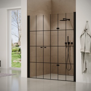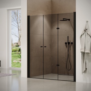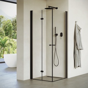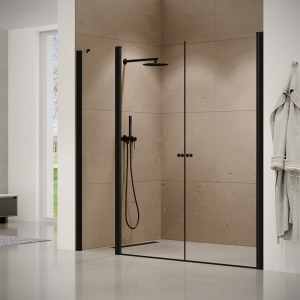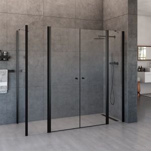 מקלחון חזית | קבוע + שתי דלתות | פרופיל שחור מט | זכוכית שקופה | דגם "קאטרו" | מק"ט 1300