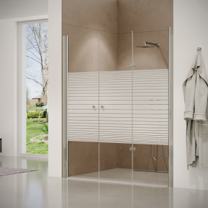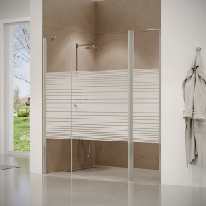מקלחון פינתי | שתי דלתות + דופן צד | פרופיל כרום | זכוכית פסים | דגם "באקר" | מק"ט 1346