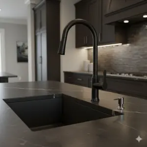 היתרון של מעצב הפנים הוא שכבר בתחילת הדרך הוא רואה בדמיונו את המראה הסופי של המטבח. לכן אם הבחירה היא לדוגמה על ארונות בצבע שחור ההמלצה תהיה על ברז שחור או ברז בעל אלמנטים של ברונזה המשתלבים נפלא עם הפרזול של ארונות המטבח.