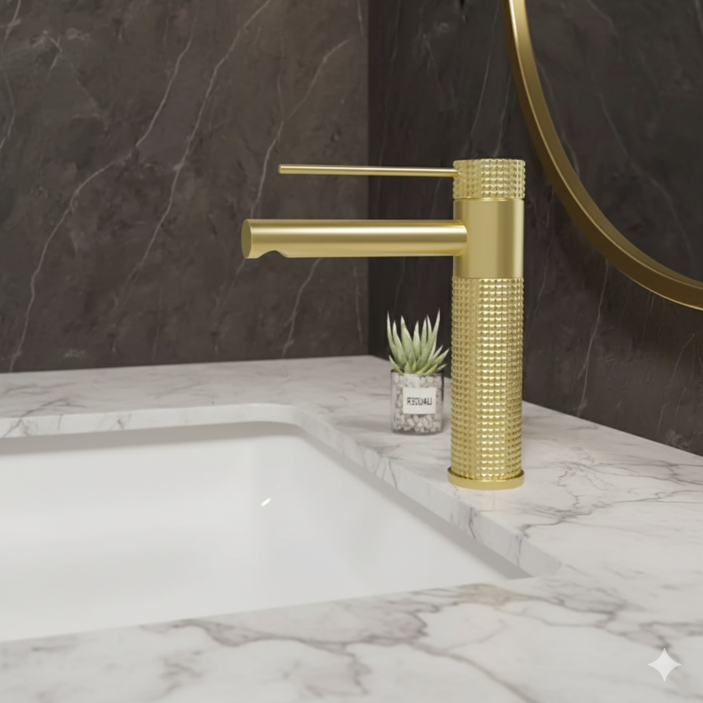 ברז אופנתי מעוצב לכיור אינטגרלי | דגם "עומרי" מחוספס | זהב מוברש | מק"ט – 193/2B