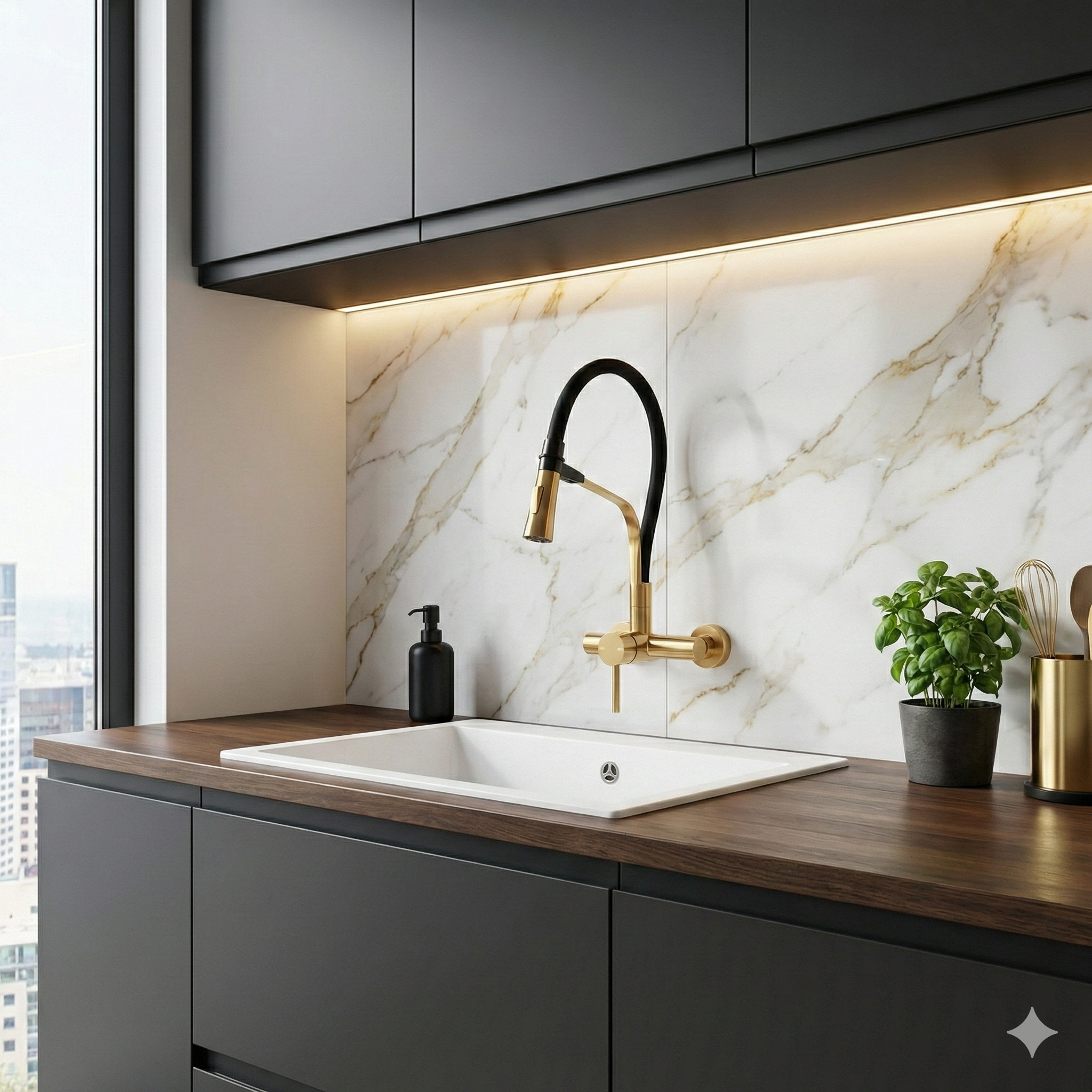 היה הראשון לכתוב סקירה “ברז מטבח מהקיר + פיה גמישה | דגם "ברנדון" | זהב מוברש בשילוב שחור מט | מק"ט 613/2”