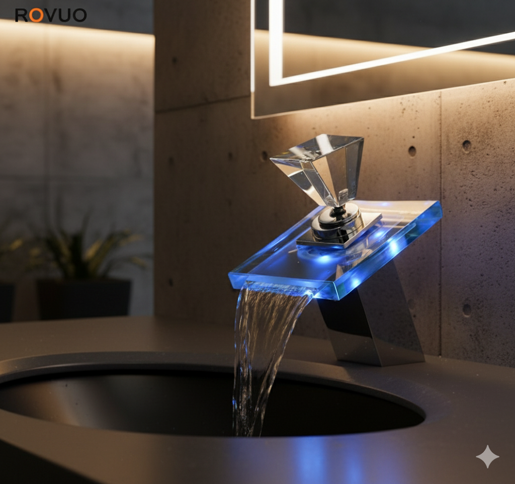 ברז מיקס לכיור מקלחת מפל זכוכית שקוף לד ידית יהלום