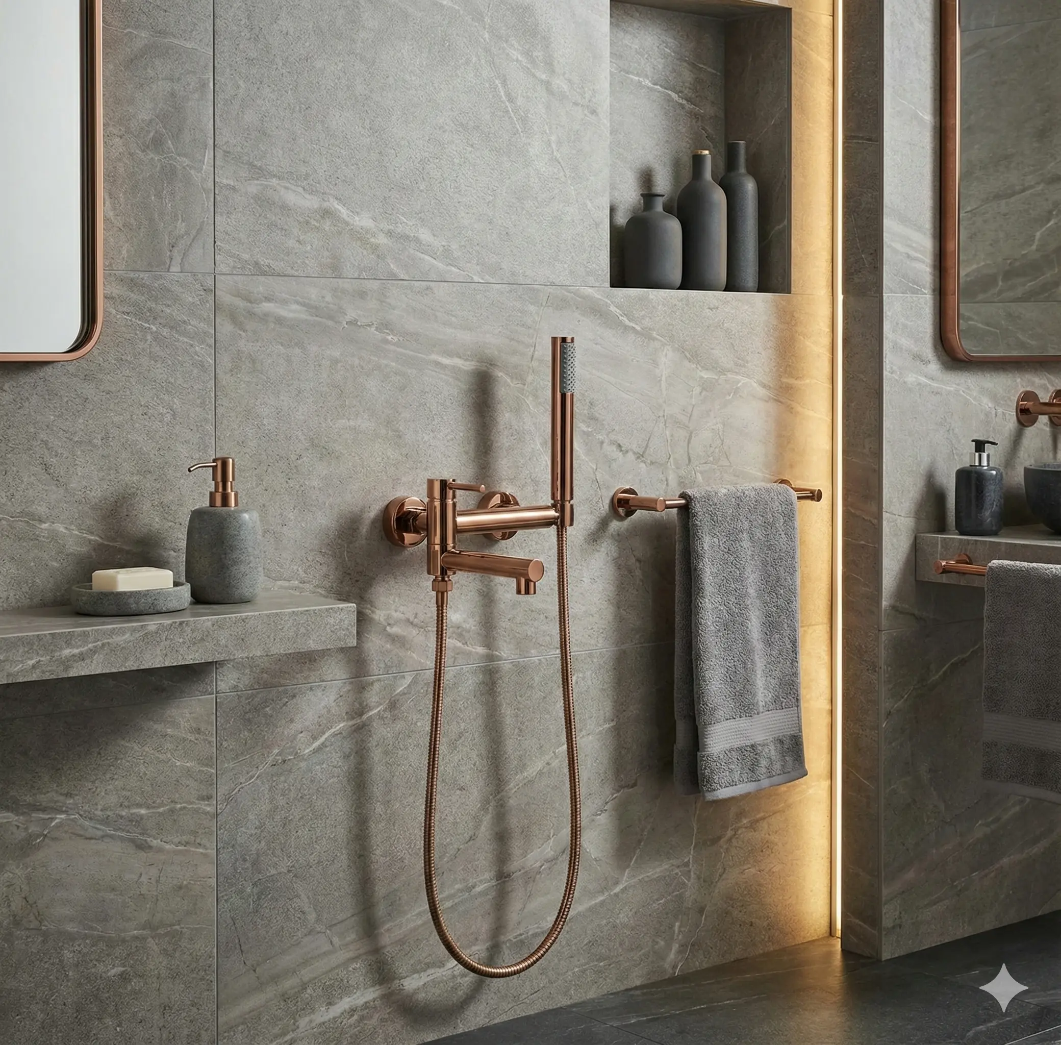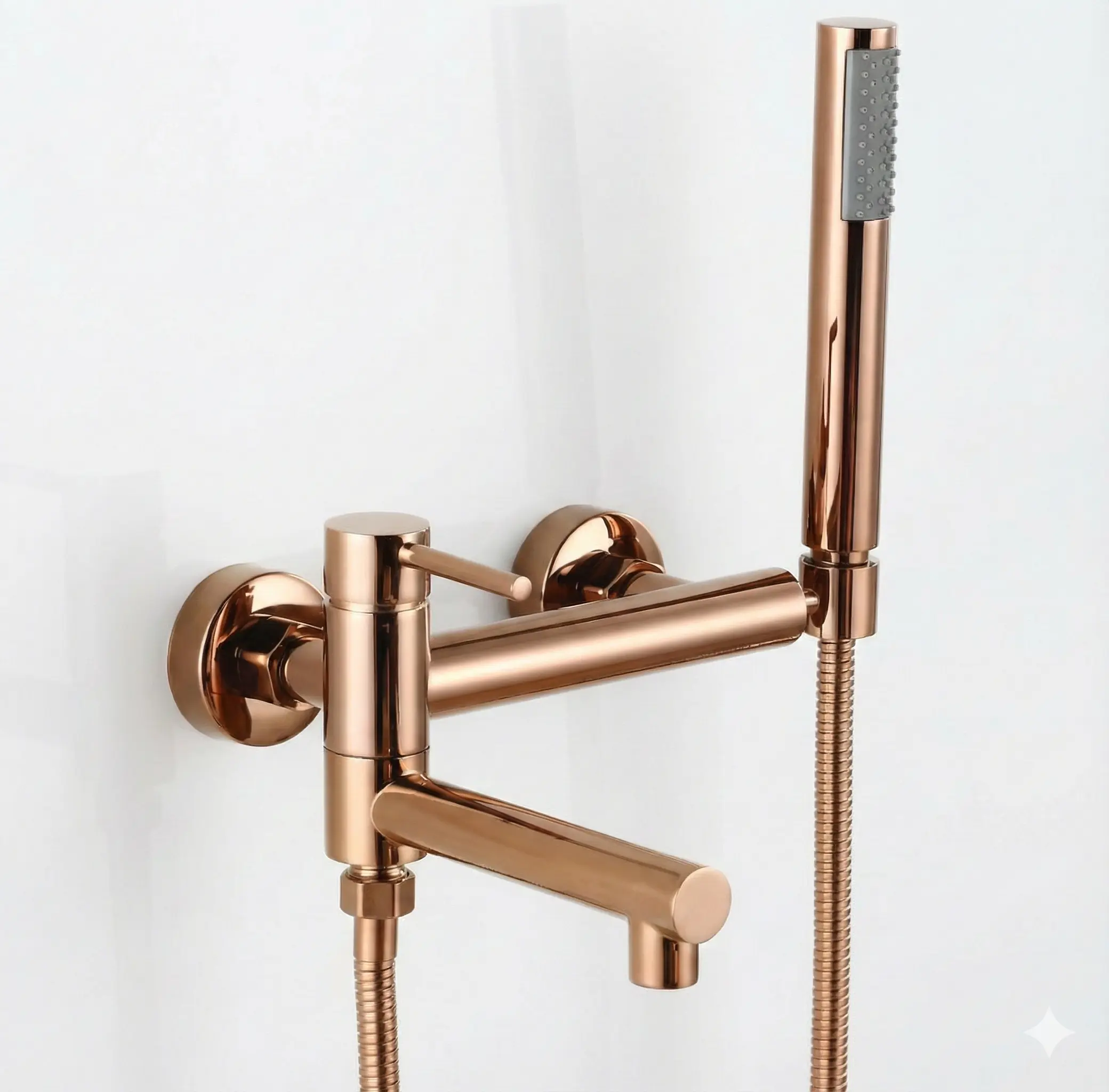 סוללה לאמבטיה אופנתית איכותית פיית מילוי מתקפלת +מזלף יד וצינור גמיש | רוז גולד | מק"ט 1901/4